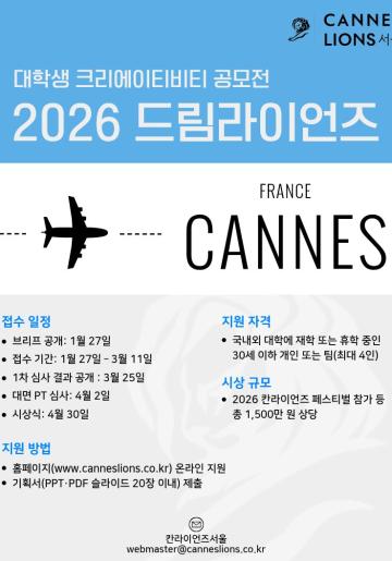 -그랑프리: 2026년 칸 라이언즈 페스티벌 Student Pass 2매 & 페스티벌 기간 중 숙박, 항공편, 인증서