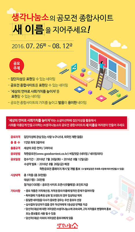- ‘세상의 언어로 사회가치를 높이자’라는 소셜미션하에 집단지성을 활용해서 사회를 아름답게 만들고자하는 ㈜생각나눔소의 공모전 종합사이트의 새이름을 여러분이 만들어 주세요