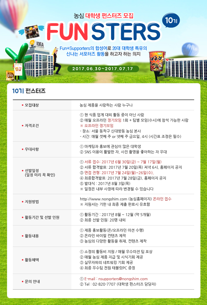 - 대학생 펀스터즈 담당자 : Tel. 02-820-7707 / E-mail. nsupporters@nongshim.com