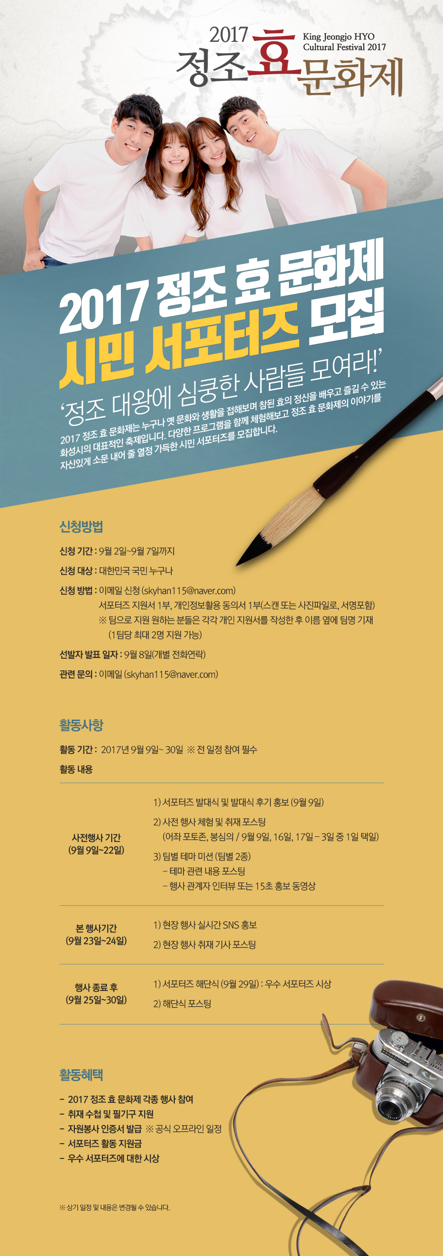 - 2017 정조 효 문화제의 다양한 프로그램을 함께 체험해보고 정조 효 문화제의 이야기를 자신있게 소문내어 줄 열정 가득한 시민 서포터즈를 모집합니다!
