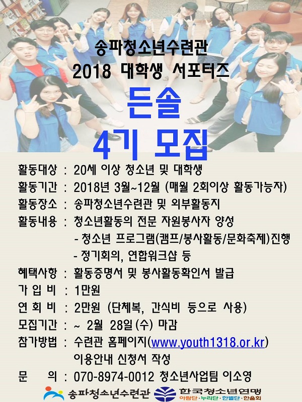 - 송파청소년수련관에서 ' 2018 대학생 서포터즈 든솔' 을 함께할 서포터즈를 모집합니다.