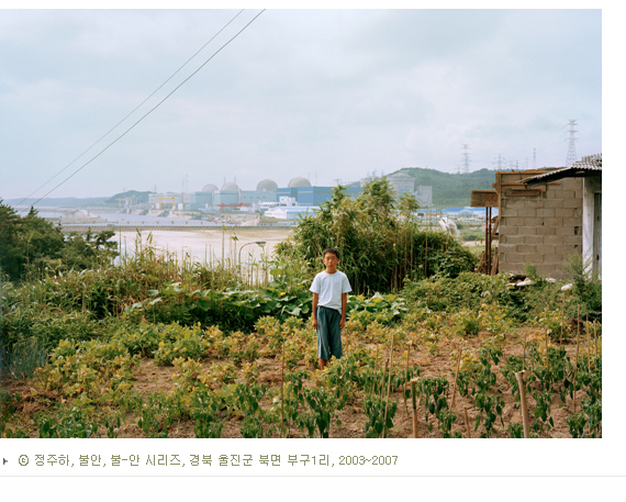정주하는 ‘불안, 불-안’(A Pleasant Day) 시리즈에서 한국의 영광, 울진, 월성, 고리에 있는 원자력발전소 주변 마을의 일상생활과 원자력 발전소를 배경으로 한 풍경사진을 찍었다. 집 앞의 텃밭에서 천진한 표정으로 카메라를 응시하는 소년, 모래사장에서 가족과 함께 조개를 줍고, 수영을 즐기며 한가로운 오후를 보내고 있는 장면들은 얼핏 보기에 평범하고 평화로운 바닷가 마을의 장면이다. 그러나 풍경 너머 곳곳에 산재하는 원자력발전소의 모습을 확인하는 순간, 그곳은 더 이상 평온한 곳이 되지 못한다. 작가는 후기 자본주의가 선사해준 물질적 풍요와 편리함의 이면에 가려진 그리고 밋밋한 우리의 일상 속에 깊숙이 스며들어있는 위험성과 불안감을 드러내고자 한다.