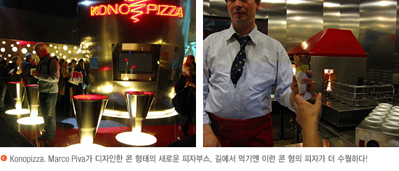 본관에서 열린 Dining Design의 연장으로 밀라노 모던 디자인 미술관 Triennale에서 Street Dining Design 이라는 주제 아래 열린 전시는 열명의 건축가, 디자이너가 제안하는 길에서 먹는 음식문화로 현대 도시 특히 이태리에서 하루 중 다양한 시간대에서 소비되는 열 가지의 음식의 길거리 부스에 대한 프로젝트였다. 바쁘게 돌아가는 현대 도시의 이미지에 대한 영상물 아래 열 가지 음식, 길거리 파킹과 공원의 모습까지 U자형의 전시장 안에 들어선 작은 디자인 거리. 부스 디자인 뿐 아니라 길 위의 음식답게 새롭게 변형되고 디자인된 열가지 먹거리들을 계속 무료로 제공했다! 디자인된 실제의 거리에 간 듯 각각의 부스들 앞에는 음식을 위해 기다리는 사람들로 가득!