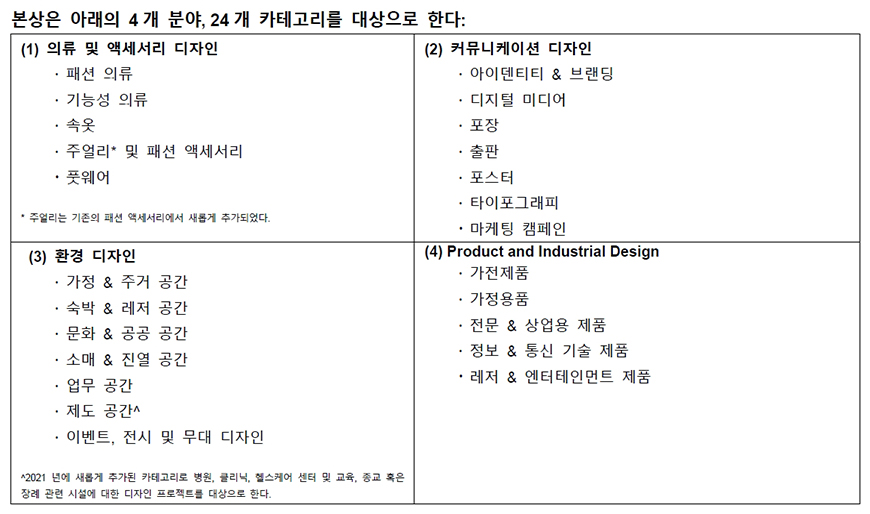 올해는 본상의 카테고리가 기존보다 확대됐다. 카테고리는 의류 및 액세서리 디자인, 커뮤니케이션 디자인, 환경 디자인, 제품 및 산업 디자인 등 4개 분야를 대상으로 23개에서 24개로 확대돼 이루진다.