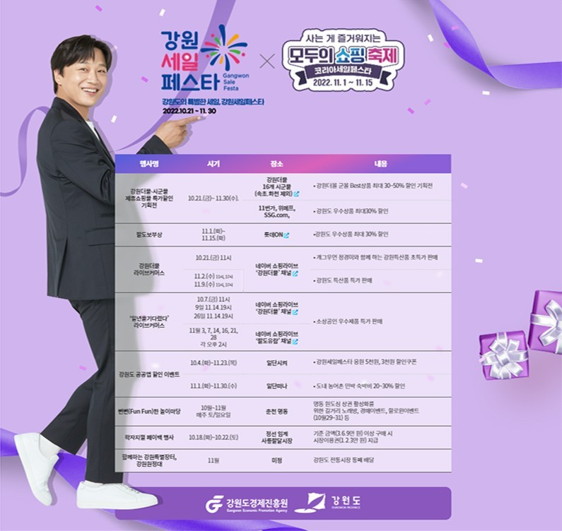 한편, ‘2022 강원세일페스타’는 오는 11월 30일까지 개최되는데, 이 기간에 강원도 대표 온라인 쇼핑몰인 ‘강원더몰’과 16개 시·군 몰(속초·화천 제외)에서 지역 특산품을 최대 50% 할인된 가격으로 판매한다.