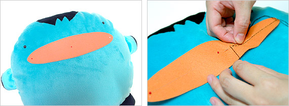 8. 주황색 팰트지로 만든 오구리 입을 오구리의 적당한 위치에 배치시키고 시침핀으로 고정시킵니다. 그리고 검정색실로 박음질 해 주세요