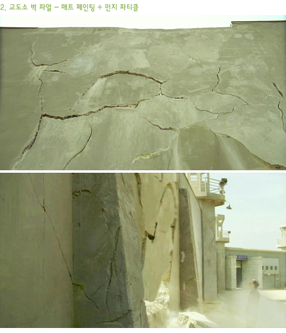 후반작업에서는 벽이 서서히 갈라지는 금은 매트 페인팅으로 작업해서 애프터 이펙트에서 마스크로 갈라지는 움직임을 애니메이션하고, 아래 두 번째 장면은 같은 카메라 뷰에서 사람을 찍고 무너지는 벽을 따로 찍어 합성했습니다.