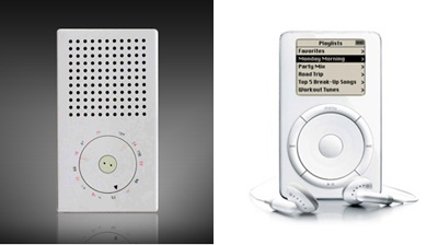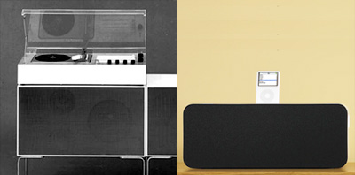 램의 작품인 Braun T3 pocket radio와 Apple i-pod.