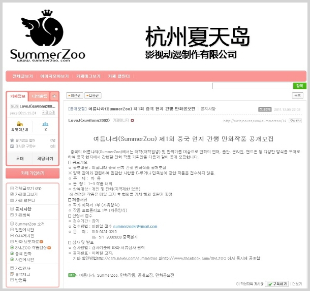 중국의 여름나라(SummerZoo)에서는 대학(대학원생) 및 만화가를 대상으로 만화의 연재, 출판, 온라인, 핸드폰 등 다양한 방식을 무대로 하여 중국 현지에서 간행할 만화 작품 기획안을 다음과 같이 공개 모집합니다.