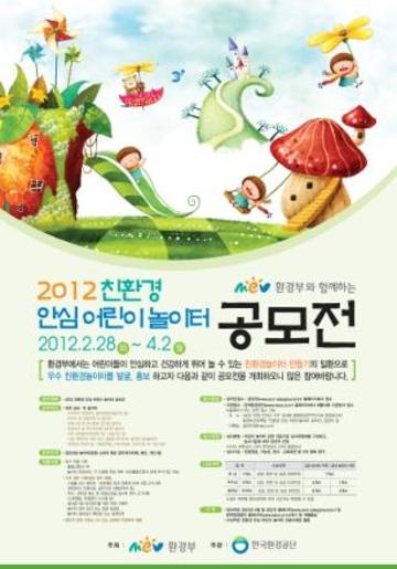 “친환경 안심 어린이 놀이터 공모전”참가 안내 환경부에서 어린이들이 안심하고 건강하게 뛰어 놀 수 있는 친환경놀이터 만들기의 일환으로 우수 친환경 놀이터를 발굴, 홍보하고자 한국환경공단에 의뢰하여 다음과 같이 공모전을 개최하오니 많은 관심과 참여바랍니다.