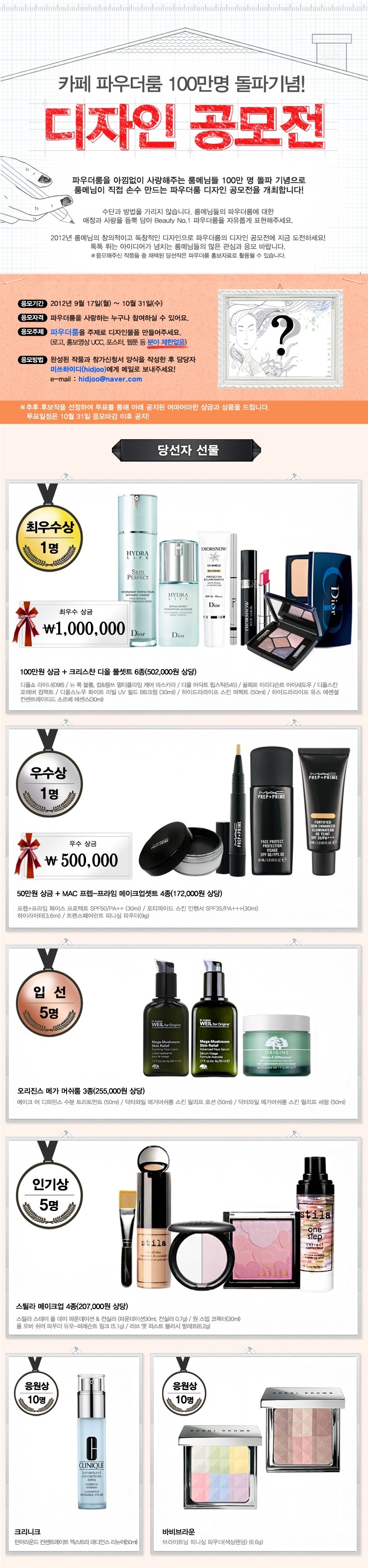 ▶ 당첨선물 : 최우수상 : 100만원 상금 + 크리스챤 디올 풀셋트 6종(50만원 상당) - 1명