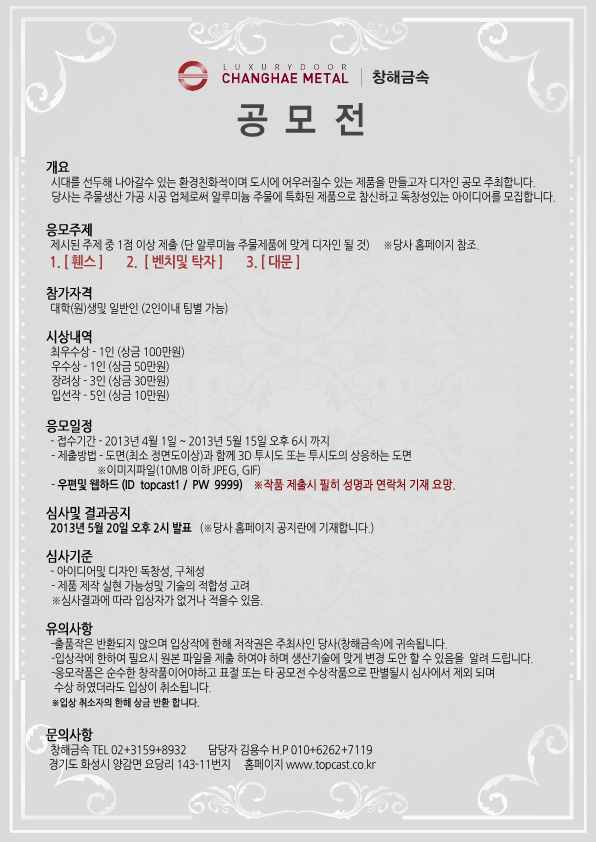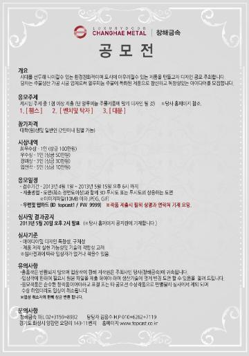 - 출품작은 반환되지 않으며 입상작에 한해 저작권은 주최사인 당사(창해금속)에 귀속됩니다.