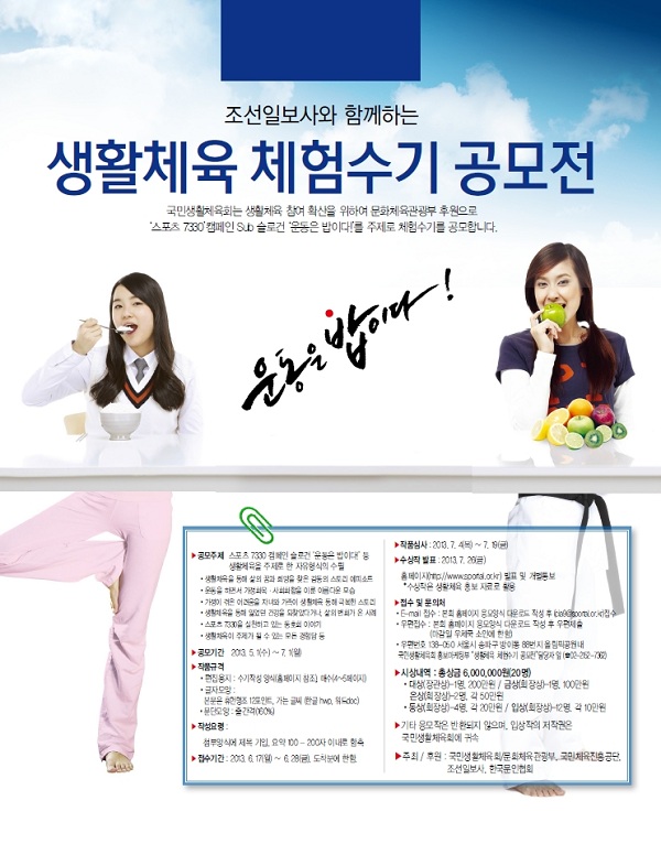 - 스포츠 7330 캠페인 슬로건 ‘운동은 밥이다! 등 생활체육을 주제로 한 자유형식의 수필