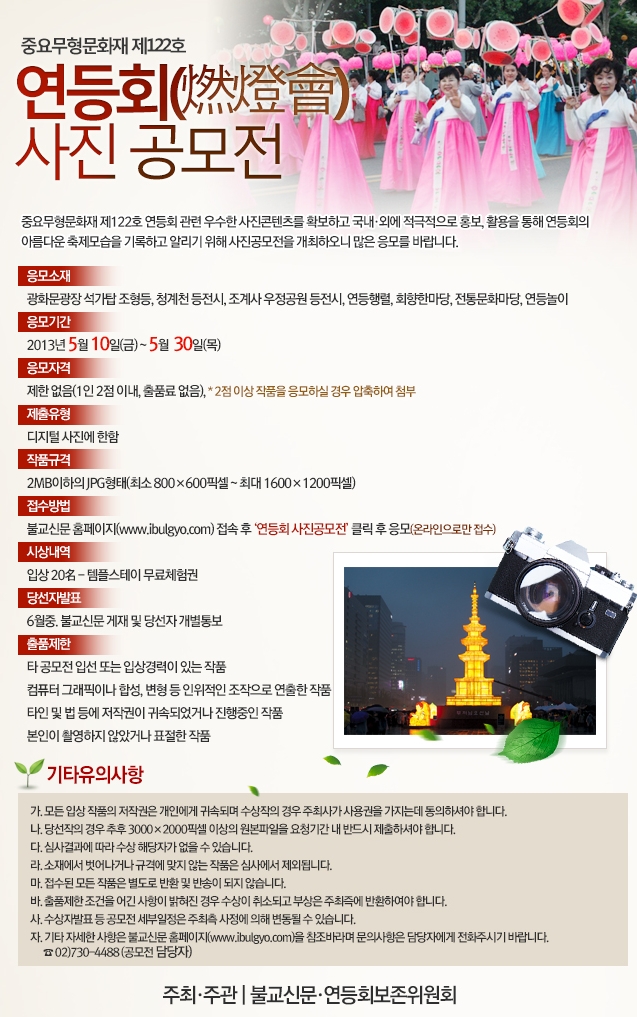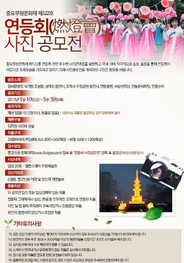중요무형문화재 제 122호 연등회 관련 우수한 사진콘텐츠를 확보하고 국내·외에 적극적으로 홍보, 활용을 통해 연등회의 아름다운 축제모습을 기록하고 알리기 위해 사진공모전을 개최하오니 많은 응모 바랍니다.