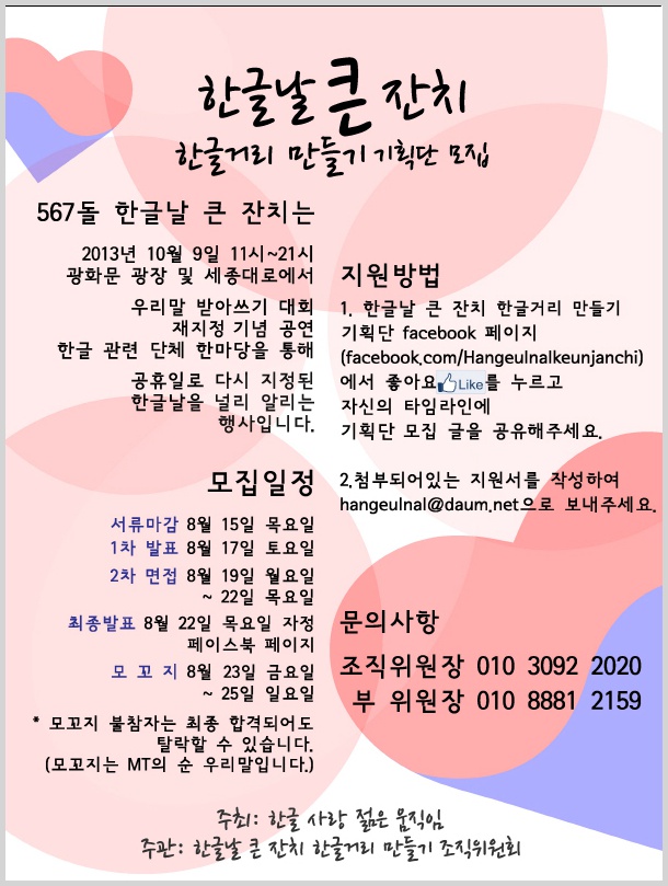 - 페이스북 페이지 댓글이나 한글날 큰 잔치 네이버 카페에 공유한 내용을 알려주시면 됩니다.