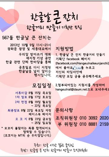 -  페이스북(www.facebook.com/Hangeulnalkeunjanchi)
