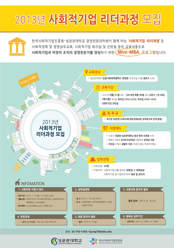 - 한국사회적기업진흥원-성균관대학교 경영전문대학원이 함께 하는 ‘사회적기업 리더과정’은 사회적경제 및 경영실무교육, 사회적기업 워크샵 및 인턴쉽 등의 교육내용으로 사회적기업과 비영리 조직의 경영전문가를 양성하기 위한 Mini-MBA 프로그램입니다.