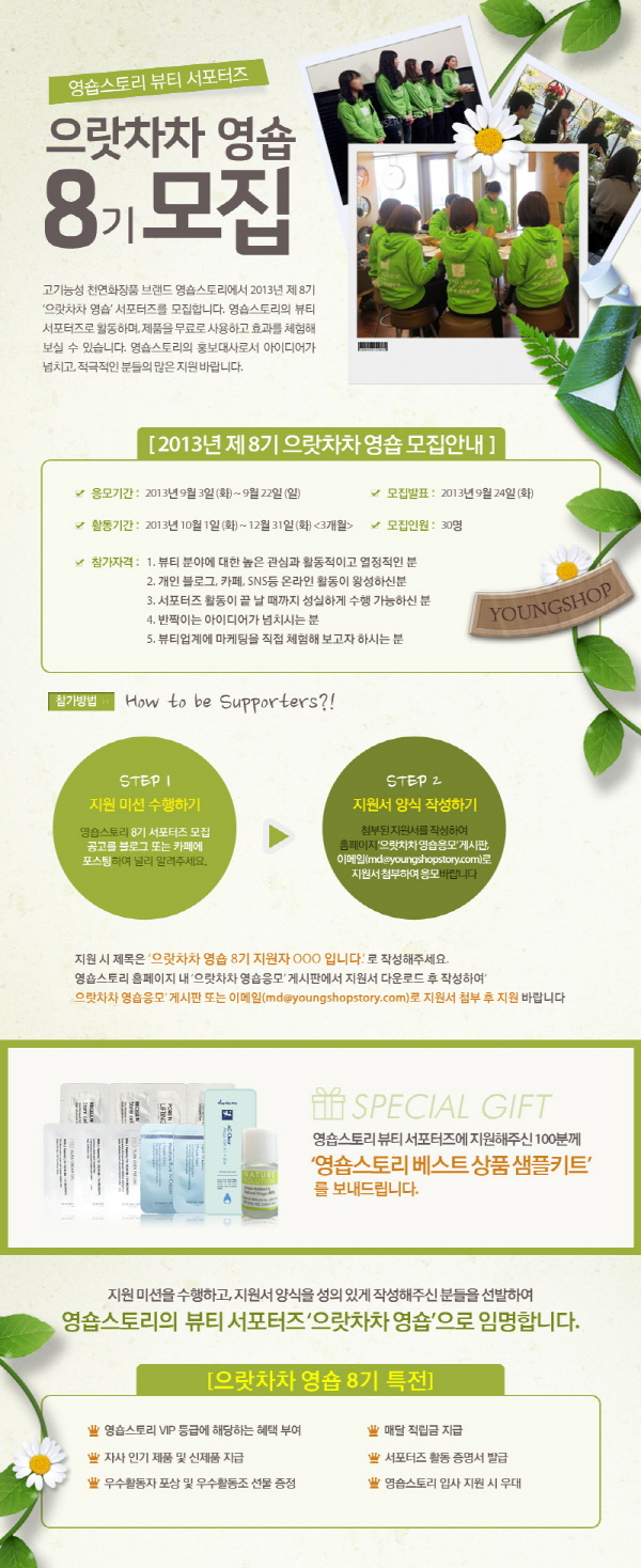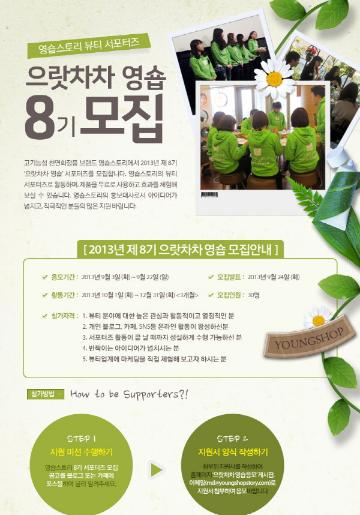 - 고기능성 천연화장품 브랜드 영숍스토리에서 2013년 제 8기‘으랏차차 영숍’ 서포터즈를 모집