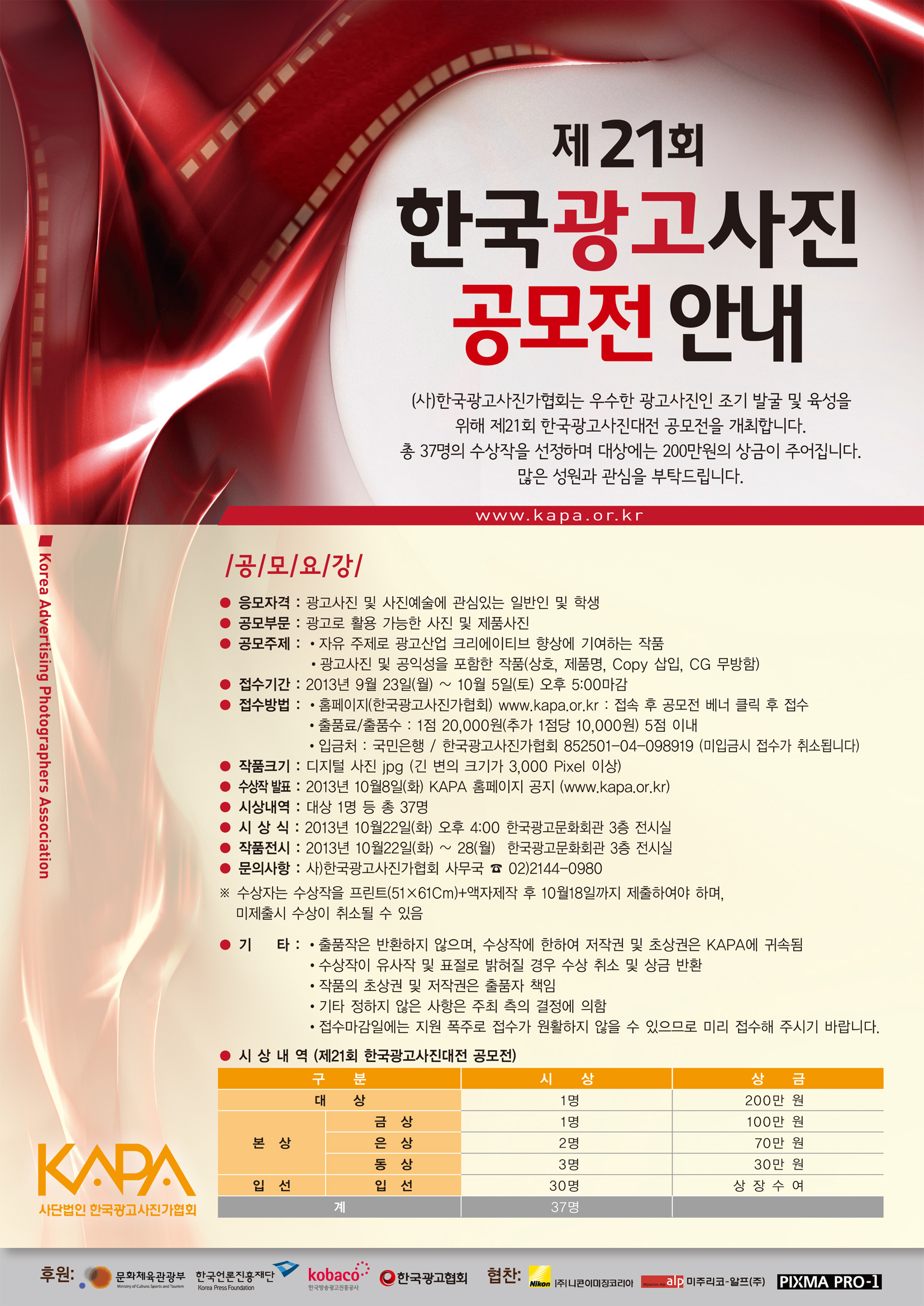 - 결과발표 : 2013년 10월8일(화) 홈페이지 공지 (www.kapa.or.kr)및 개별통지