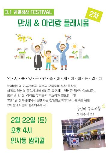 3.1 친일청산 FESTIVAL 95주년 3.1절. 우리들의 작은 힘이 필요합니다.3월 1일 청계광장에서 진행되는 친일청산 FESTIVAL 홍보를 위한 2차 플래시몹에 함께해 주세요!