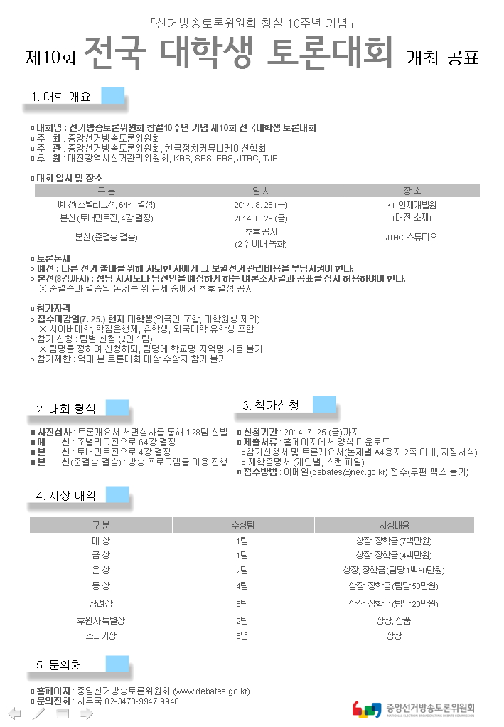- 접수 방법: 이메일 (debates@nec.go.kr)접수 (우편.팩스 불가)