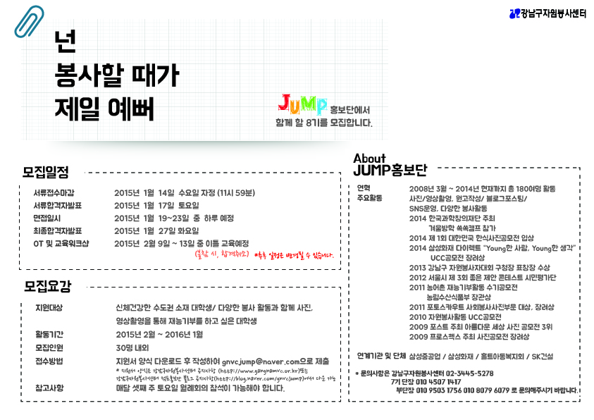 안녕하세요! JUMP홍보단 입니다 :) 2015년, 한 해의 목표는 잘 세우셨나요? 여러분들의 목표 그 사이에 JUMP홍보단이 함께하고 싶습니다. JUMP홍보단이 새로운 봉사왕, 8기를 모집합니다!