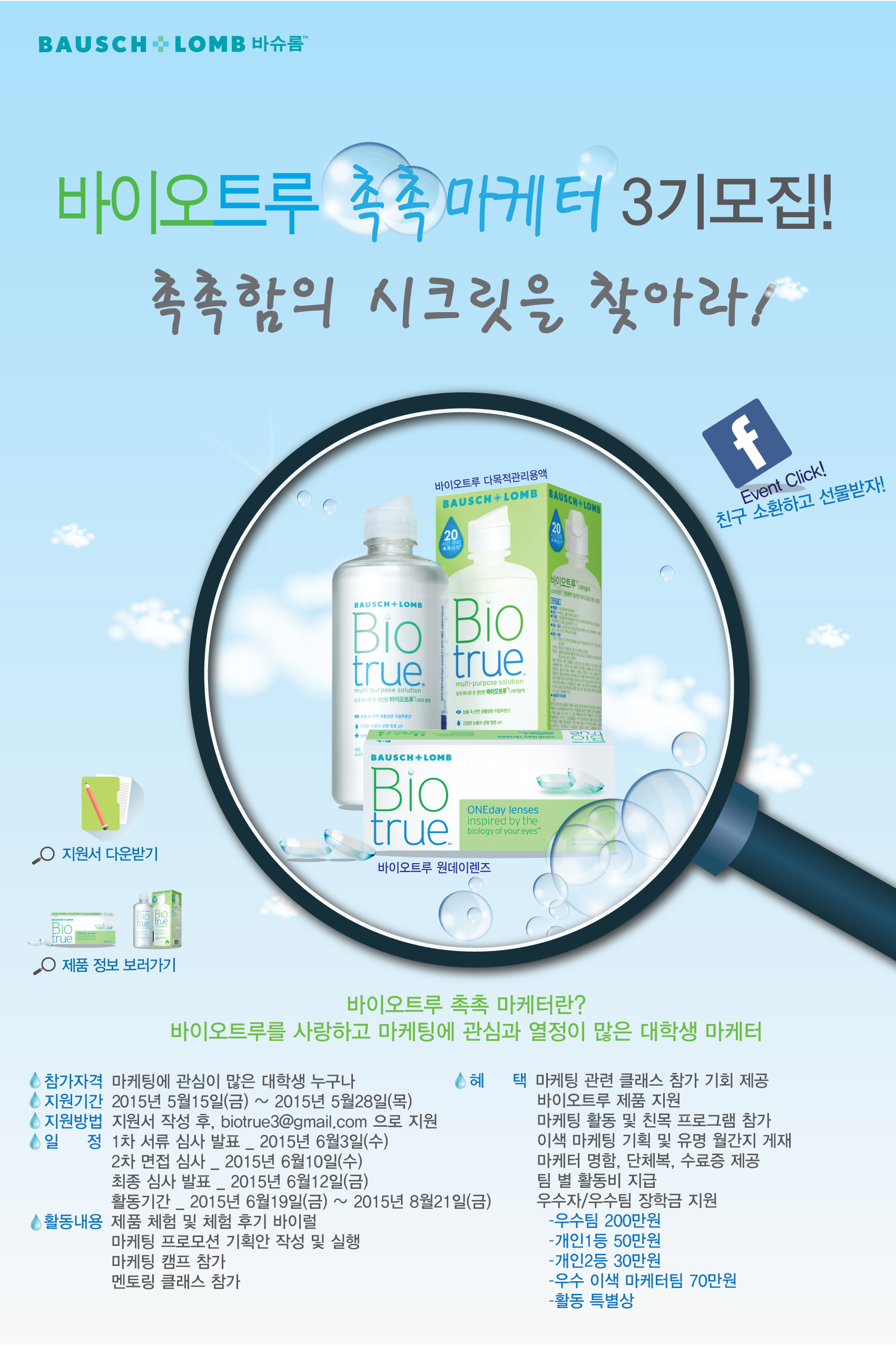 바이오트루 촉촉마케터란, 바슈롬의 아이케어 브랜드인 ‘바이오트루’를 사랑하고 마케팅에 관심과 열정이 많은 대학생 마케터입니다. 바이오트루 촉촉마케터 3기가 되면 제품체험은 물론, 마케팅 기획과 실행 그리고 마케팅 캠프와 멘토링 클래스에도 참여할 수 있다는 사실! ‘바이오트루 촉촉마케터 3기' 에 열정과 패기 있는 대학생 여러분들의 많은 지원 바랍니다^^