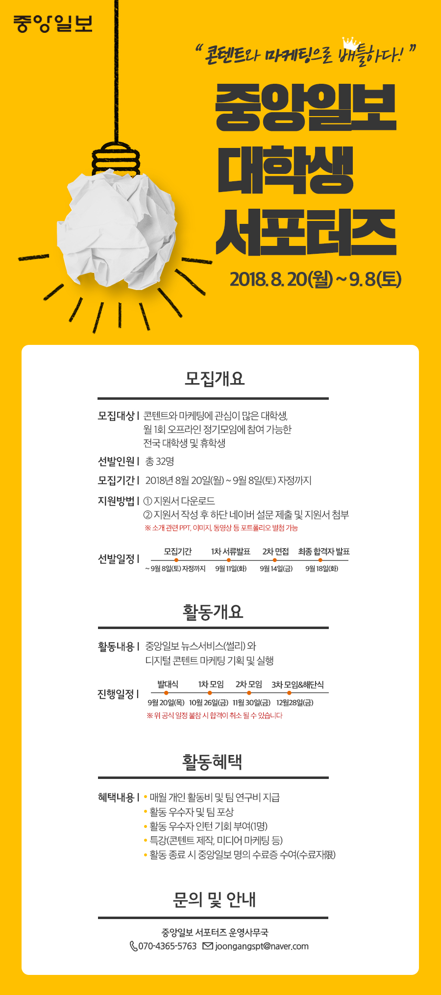 - 모집대상 : 콘텐트와 마케팅에 관심이 많은 대학생, 월 1회 오프라인 정기모임에 참여 가능한 전국 대학생 및 휴학생