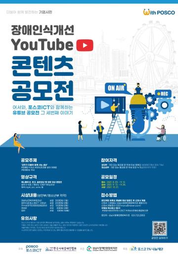 ▶공 모 명 : 장애인식개선 YouTube 콘텐츠 공모전 - 접수기간 : 2021. 08. 23.(월) ~ 2021. 09. 12.(일) 18:00까지 - 심사진행 : ▶1차 심사 : 2021. 09. 13.(월) ~ 2021. 09. 14.(화) ▶2차 심사 : 2021. 09. 16.(목) ▶최종 심사 : 2021. 09. 17.(금)~09. 24(금) - 결과발표 : ▶1차·2차·최종 : 2021. 09. 27.(월) 홈페이지 게시 및 개별 연락 ▶시 상 식 : 2021. 10. 21.(목) |