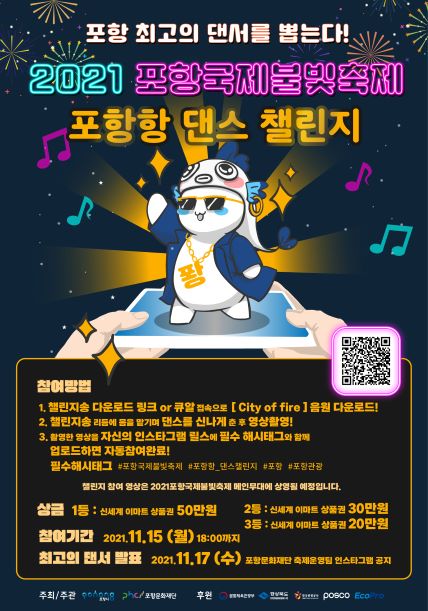 포항시와 포항문화재단이 개최하는『2021포항국제불빛축제』에서 포항을 빛낼 인플루언서를 찾기 위한 [포항항 댄스 챌린지] 참가자를 모집합니다.