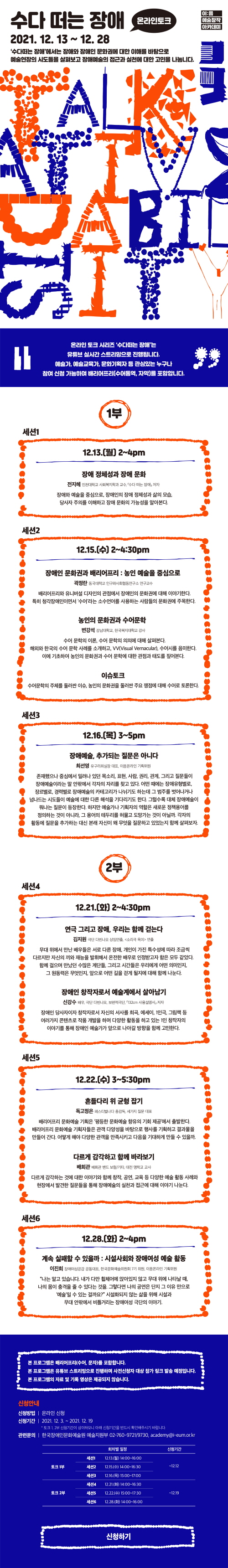 - 참가대상 장애·비장애 예술인, 문화예술 기획자, 장애예술에 관심있는 누구나