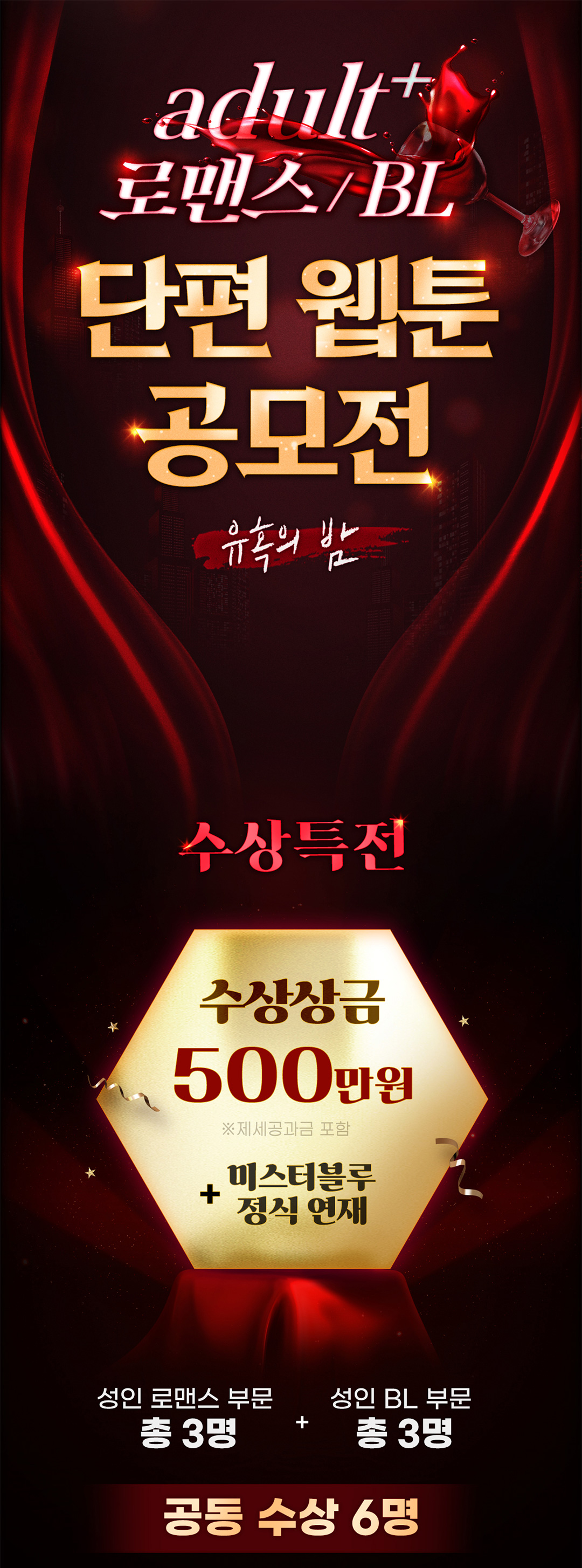 - 공동 수상 : 성인 로맨스 3작품 / 성인 BL 3작품 (상금 500만원, 미스터블루 정식 연재)