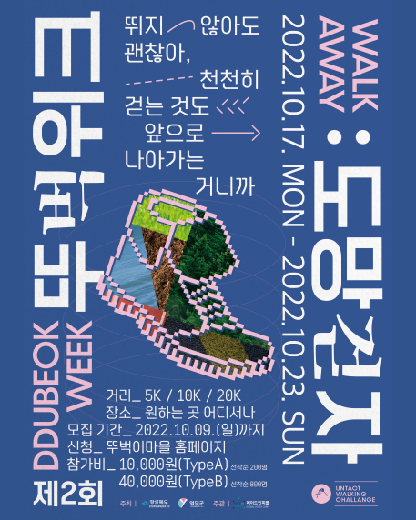 - 뚜벅위크 및 인증 기간 : 2022년 10월 17일(월) - 10월 23(일)- 거리 : 5KM / 10KM / 20KM (원하는 만큼 자유롭게!)