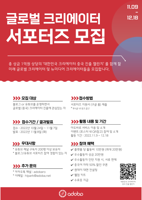 '대한민국 크리에이터 중국 진출 챌린지'를 참여할 서포터즈를 모집합니다!