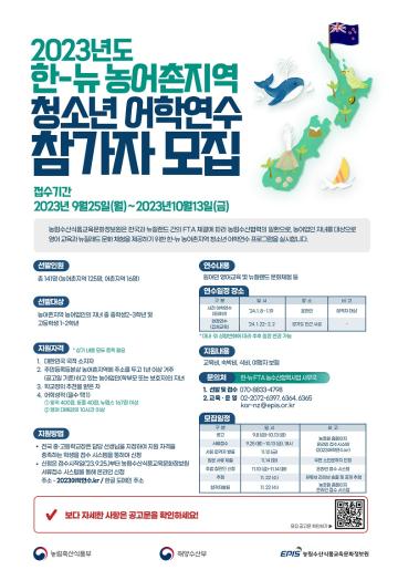 농어촌지역의 농어업인 자녀를 대상으로 영어 교육과 뉴질랜드 문화 체험 환경을 제공하기 위한한-뉴 농어촌지역 청소년 어학연수 사업을 실시합니다. 많은 참여 바랍니다.