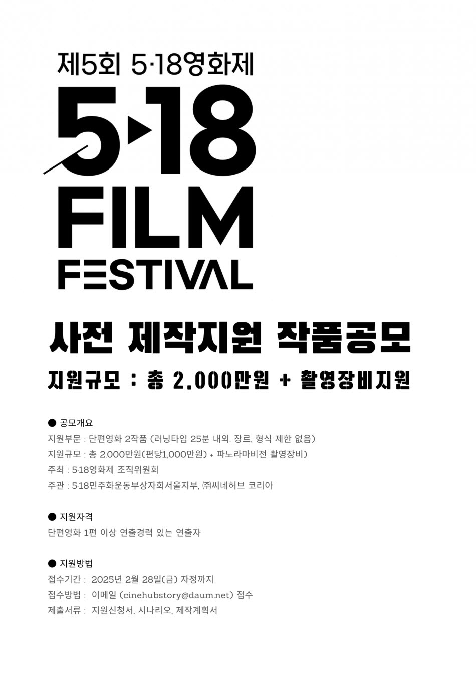 ‘5.18 민주화운동 부상자회 서울지부’와 ‘(주)씨네허브 컴퍼니’가 함께 준비하는 차기 ‘5.18 영화제’에 상영될 작품의 제작지원을 드리고자 공모를 받고 있습니다~~!! 새로운 감독님, 배우님들과 만나뵐 수 있기를 기원하며 많은 참여와 관심 부탁드립니다~
