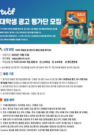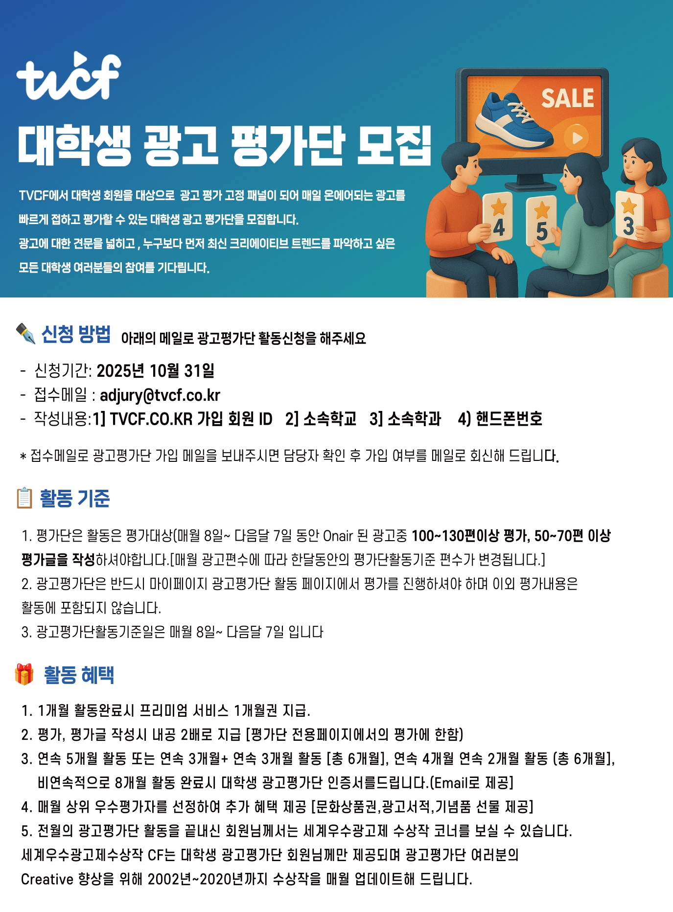 작성내용: 1) 가입이 완료된 TVCF 회원 ID 2) 소속 학교 3) 소속 학과 4) 핸드폰 번호* 접수 메일로 광고평가단 가입 메일을 보내주시면 담당자 확인 후 가입 여부를 메일로 회신해드립니다.