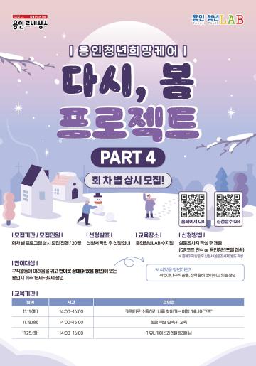 ■ 신청 방법 : "용인청년포털 청년e랑 접속 후 메인 배너 클릭(다시, 봄 프로젝트) 후 신청서 작성" 혹은 "현재 게시글 신청 접수 QR코드 인식 후 신청서 작성"