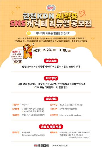 첨부파일 "한전KDN AI활용 SNS 캐릭터 리뉴얼 공모전_공모요강 및 참가신청서" 확인해 주시기 바랍니다.