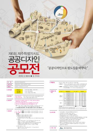 타 도시와 차별화 될 수 있는 도시브랜드를 구축하고 지역에 생기를 불어 넣어 활기 있는 도시로 재탄생하기 위해 “공공디자인으로 원도심을 바꾸다.”라는 주제로「제6회 제주공공디자인 공모전」을 개최합니다. 공모전에 대한 관심 부탁드립니다.