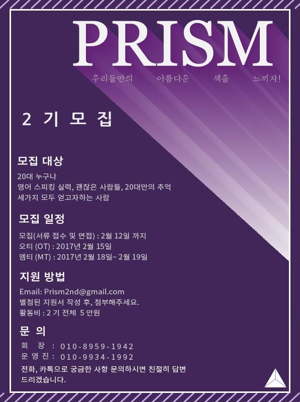 20대 영어회화 연합동아리 PRISM에서 2기 신입회원을 모집합니다.