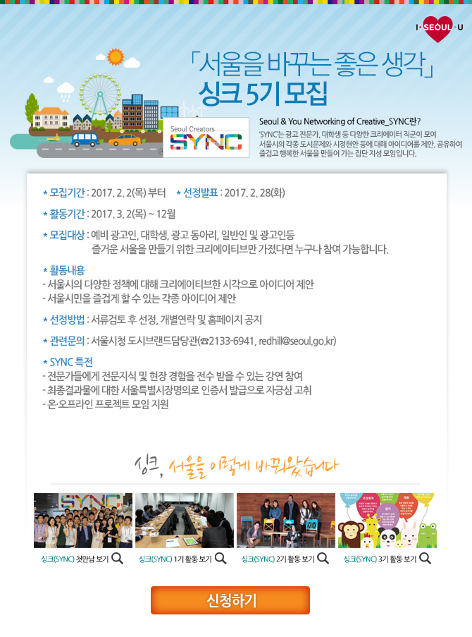 - 서울을 바꾸는 좋은 생각 싱크 5기 모집 SYNC는 광고 전문가, 대학생들 다양한 크리에이터 직군이 모여 서울시의 각종 도시문제와 시정현안 등에 대해 아이디어를 제안, 공유하여 즐겁과 행복한 서울을 만들어 가는 집단 지성 모임입니다