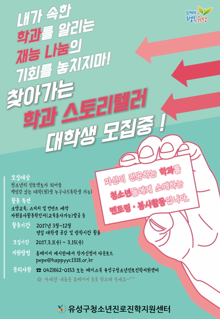 - 유성구청소년진로진학지원센터 ☎ 042) 862-0153 (담당 문명희)