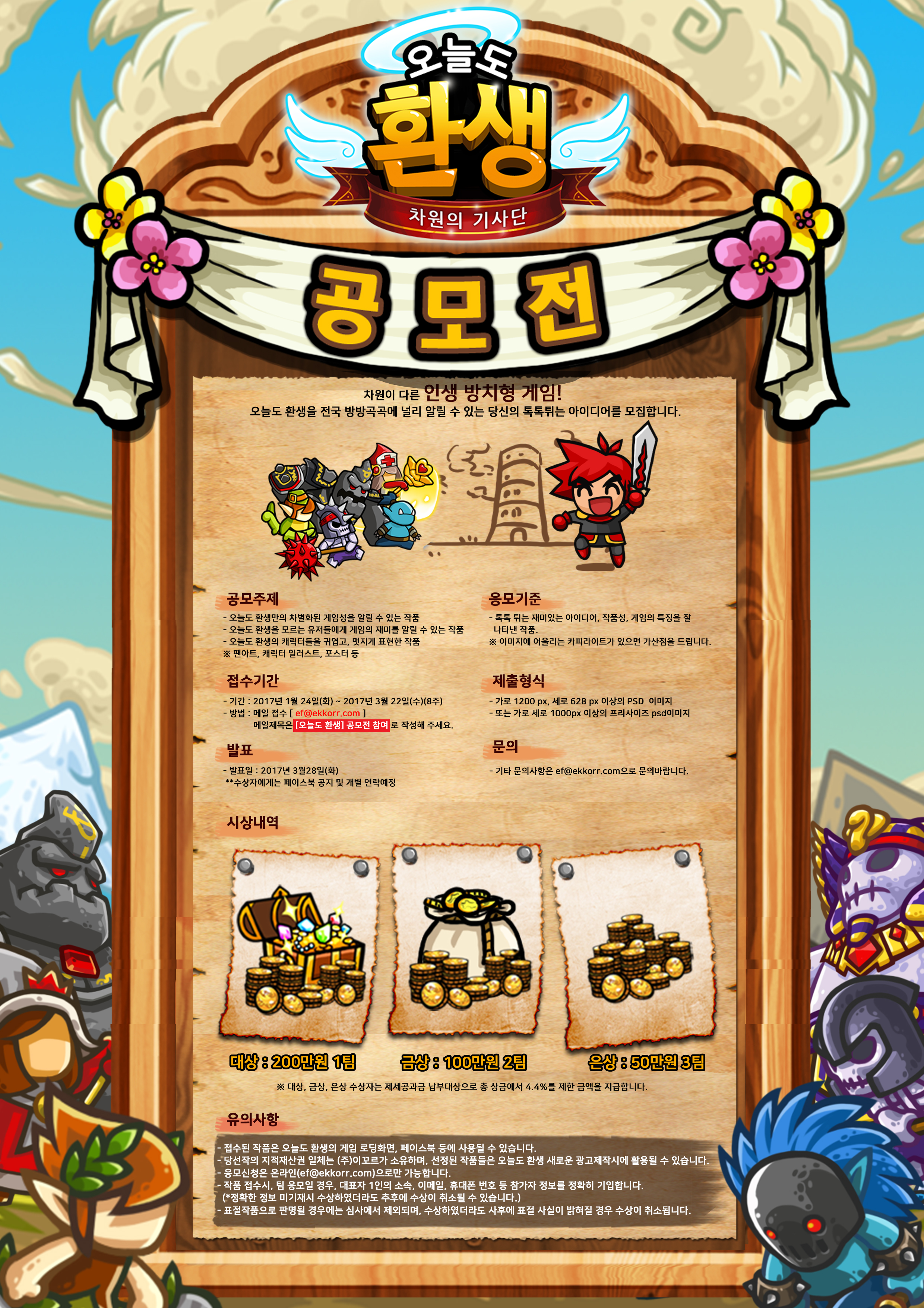 - 접수된 작품은 오늘도 환생의 게임 로딩화면, 페이스북 등에 사용될 수 있습니다.