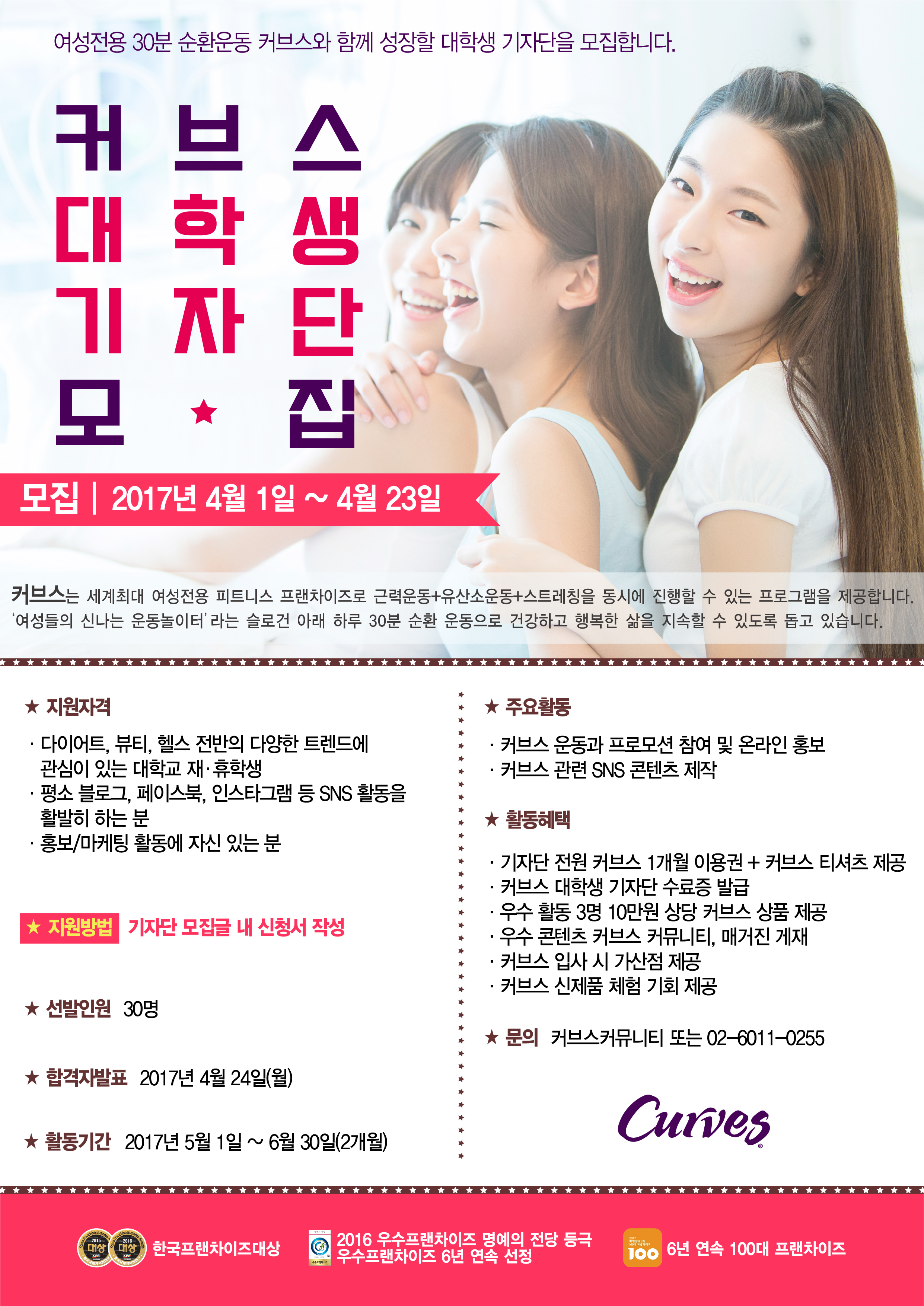 - 커브스와 함께 건강하고 아름다운 여성의 삶을 응원할 대학생 기자단을 모집 합니다! 커브스는 세계최대 여성전용 피트니스 프랜차이즈로 유산소+근력운동+스트레칭을 동시에 진행할 수 있는프로그램을 제공합니다. ' 여성들의 신나는 운동놀이터' 라는 슬로건 아래 하루 30분 순환운동으로 건강하고 행복한 삶을 지속할 수 있도록 돕고있습니다.