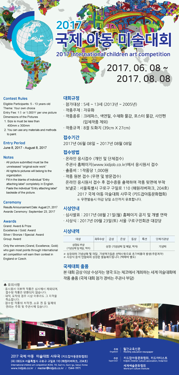 - Address: International children art competition (204 ho) 110 Kuilro Kuroku, Seoul, KOREA