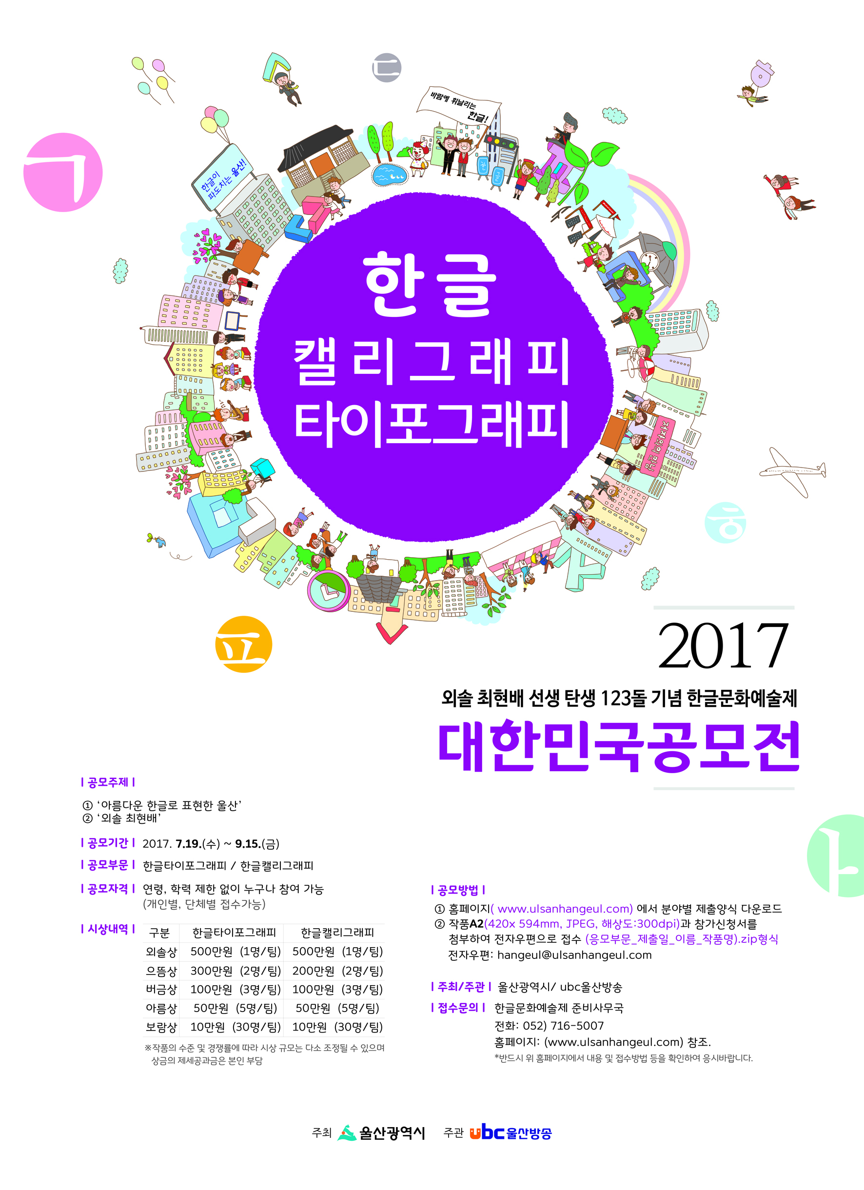 - 한글 학자 외솔 최현배 선생의 탄생 123돌을 맞이하여, 외솔 최현배 선생의 고향이자 활동지였던 울산광역시에서 ‘한글문화예술제’를 개최합니다. 2017년 10월 개최되는 이 예술제에서 한글 타이포그래피 ․ 한글 캘리그래피 공모전을 함께 개최하고자 합니다. 한글문화 중심도시, ‘울산’의 특성(외솔 최현배, 울산 12경, 반구대 암각화, 고래, 산업수도, 울산 고유지명 등)이나 ‘외솔 최현배’를 아름다운 한글로 표현한 작품공모를 통해 한글의 역사성과 전통성, 문화적 가치를 아우르는 시민참여형 예술제, ‘2016 한글문화예술제’에 힘을 더하고자 합니다. 여러분의 많은 관심과 참여 부탁드립니다.