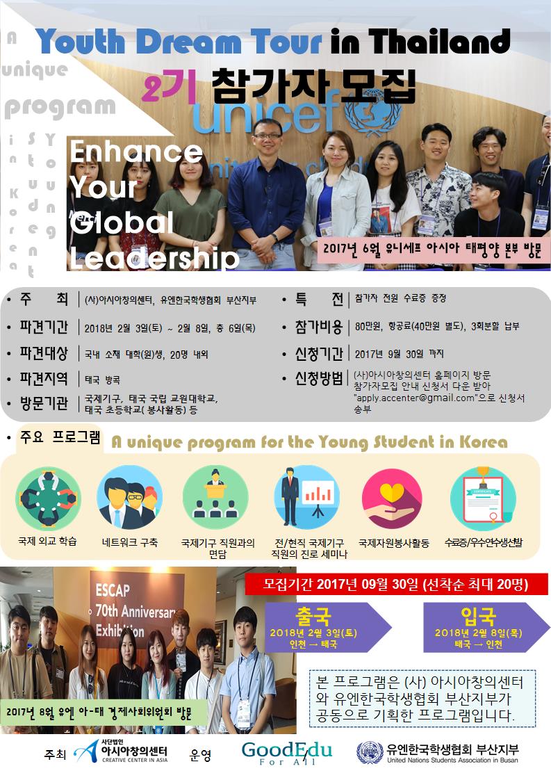 (사)아시아창의센터에서 대한민국 청년들 대상으로 Youth Dream Tour in THAILAND 2기 프로그램을 실시합니다. 국제기구, 국제진로, 봉사활동, 문화탐방에 관심 있는 분들의 많은 참여부탁드립니다.