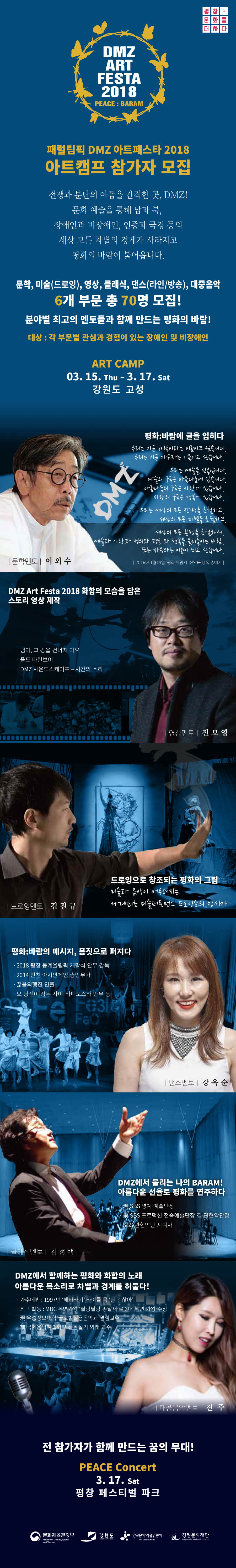- 전쟁과 분단의 아픔을 간직한 곳, DMZ! 문화 예술을 통해 남과 북 장애인과 비장애인, 인종과 국경 등의 세상 모든 차별의 경계가 사라지고 평화의 바람이 불어옵니다.