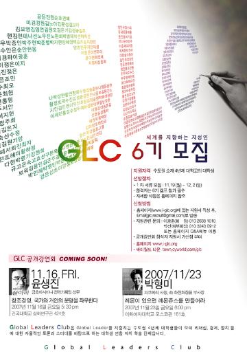 |      ◎ 세계를 지향하는 지성인 global leaders club 6기 모집 ◎ 대학생 연합 자치 학술 단체 글로벌리더스클럽(glc)에서 제6기 회원을 모집합니다. glc는 global leader를 지향하는 수도권 4년제 대학생들이 모여 리더십, 경제, 정치, 사회 등에 대한 자율적인 토론과 스터디를 바탕으로 하는 대학생 연합 자치 학술단체 입니다. glc는 방학 중의 캠프, 학기 중의 스터디, 꼭 만나보고 싶었던 사회 각 층 연사들의 특강, 수도권 지역 35 개 대학의 회원들과의 인적 네트워크 형성, 산업시찰 등 대학생으로서 누릴 수 있는 다양한 활동들을 통해 당신의 대학생활을 한 층 풍요롭게 만들 수 있는 기회입니다. 세계를 지향하는 지성인들의 모임 glc에서 바로 당신을 기다립니다. 포스터의 마지막은 여러분의 이름으로 장식해주세요. ◆ 지원자격 - 수도권 소재 4년제 대학교의 대학생 (휴학생 지원가능) - 글로벌 리더를 향한 glc 활동(방학중 활동, 학기중 스터디)에 참여가능한 자 * 캠프 및 방중미션 참가 필수 ◆ 모집인원 70 명 ◆ 선발절차 - 1차 서류전형 07.11.19(월) - 07.12.02(일) - 1차 합격자발표 07.12.15토) ◆ 활동기간 - 6기 커리큘럼 : 2007년 1월~2007년 7월 - 최소 한 학기 이상 활동 ◆ 지원방법 1. 홈페이지(www.i-glc.org)에 있는 지원서 양식을 성심성의 껏 작성해주신 후, 각종증명서(필요 시) 스캔본과 함께 이메일로 접수하여 주시면 됩니다. e-mail : glc.recruit@gmail.com 2. gmail은 수신확인이 되지 않으니, 참고 바랍니다. 메일 발송 시 자동으로 회신이 되오니, 회신메일이 가지 않으신 분은 개별연락 바랍니다. 3. 파일명은 glc_이름_학교명 으로 접수하여 주시기 바랍니다. (정해진 파일명과 다를 시 불이익이 있을 수 있습니다.) ◆ 지원관련 문의 - 홈페이지(http://www.i-glc.org) q& a 게시판을 이용해 주세요. - 회장 이 광 훈 010-2638-1010 - 부회장 박 선 아 010-3243-0912 ◆ glc 설명회 및 릴레이공개강연회 * 6기 지원자 공개강연회 참석 시 가산점 부여 1. 첫번째 공개강연회 - 연사 : 윤생진 (금호 아시아나그룹 경영전략본부 상무,저서 미치게 살아라!) - 일시 : 2007.11.16(금) 늦은 5시 30분 - 장소 : 건국대학교 상허연구관 424호 - 주제 : 창조경영이 개인의 국가와 운명을 바꾼다. 2. 두번째 공개강연회 - 연사 : 박형미 (파코메리 사장, 전 화진화장품 부회장 ,저서 벼랑끝에 나를 세워라 !) - 일시 : 2007.11.23(금) 늦은 6시 - 장소 : 이화여자대학교 포스코관 161호 - 주제 : 레몬이 주어지면 레몬주스를 만들어라! ◆ glc소개 ◎ 설립목적 본 단체는 비정치적, 비영리적 순수 대학생 연합자치동아리로서 글로벌 리더가 되기 위한 자질을 함양하기 위해 연구, 노력, 실행하는 인재를 키우고 순수 학술활동을 추구함으로써 사회에 기여함을 목적으로 한다. ◎ glc비전 ▪ 올바른 리더십을 갖춘 인재 ▪ 국제적 감각을 갖춘 인재 ▪ 과거와 현재를 통해 미래를 내다볼 수 있는 통찰력을 가진 인재 홈페이지 : www.i-glc.org 싸이월드 타운 : http://town.cyworld.com/glc ================================================================ 세계를 지향하는 지성인 global leaders club ================================================================  |